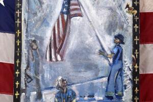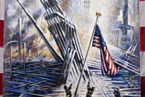 En una de las pinturas se muestra a los bomberos levantando la bandera de Estados Unidos en la zona Cero de los atentados del 11S.