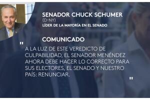 Chuck Schumer, senador por Nueva York y líder de la mayoría demócrata, pidió a Menéndez separarse del cargo. "A la luz de este veredicto de culpabilidad, el senador Menéndez debe ahora hacer lo que es correcto para sus electores, el Senado y nuestro país: renunciar".