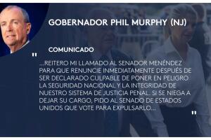 El gobernador de Nueva Jersey, Phil Murphy, quien se encuentra de viaje en Alemania, pidió al Senado que vote para expulsar a Menéndez si este se niega a renunciar. "Si se niega a dejar su cargo, pido al Senado de Estados Unidos que vote para expulsarlo".