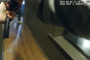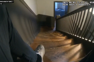En la cámara corporal de Rivera, se aprecia cómo apunta hacia la puerta del departamento del sospechoso, mientras delante de ella se encuentra su compañero.