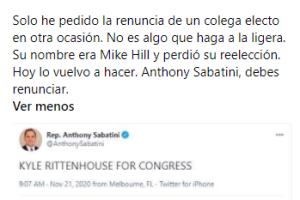 Sabatini publicó el 21 de noviembre en su cuenta de Twitter: “Kyle Rittenhouse para el Congreso”, lo que le valió una oleada de críticas en la red social, aunque también hubo seguidores que alabaron su publicación.