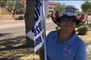 La instalación estaba adornada con banderas estadounidenses y de Arizona a pocos metros el pequeño grupo ondeaba banderas y gritaba consignas respaldando su reelección.