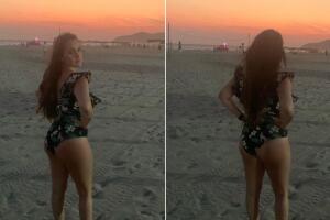 Dulce María, de 37 años, aparece en las instantáneas mirando a la cámara con el atardecer de fondo en un traje de baño con estampado de flores con algunos detalles de volantes en las mangas y en el escote.