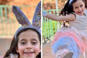 Máxima posó para la cámara con un vestido largo de volantes rosas y celestes, sandalias con un pompón de tul rosa y una diadema con orejas de conejo de lentejuelas.