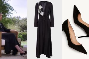 En los adelantos que la televisora ha ido publicando se puede ver que Meghan eligió un vestido de profundo escote en V confeccionado en tres capas de georgette de seda negra con cinturón de Giorgio Armani. La pieza tiene un costo de $4.700 dólares y lo llevó con unos tacones de Aquazzura de $695.