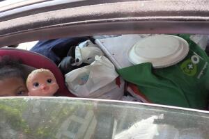 Ella vive en su auto desde el inicio de la pandemia. Aquí tiene bolsas sus con pertenencias, todo lo que tiene cabe aquí en su auto. Entre las bolsas está su hija de cuatro años quien también vive con ella en el auto.