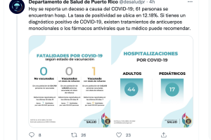 "Se reporta un deceso a causa de covid-19; 61 personas se encuentran hospitalizadas. La tasa de positividad se ubica en 12.18%. Si tienes un diagnóstico positivo de covid-19, existen tratamientos de anticuerpos monoclonales o los fármacos antivirales que tu médico puede recomendar”, tuiteó el Departamento de Salud.