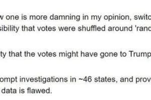 “(El autor afirma que su trabajo ha sido verificado, pero no hemos verificado los resultados, por lo que actualmente calificamos sus resultados como "no auditados"). El autor decidió obtener los datos por sí mismo y realizar un análisis de los votos nacionales cambiados de Trump a Biden y los votos borrados (la cantidad total de votos contados disminuyó en esa cantidad durante el conteo).