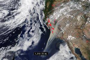El rastro de la nube se extiende hacia el suroeste frente a la costa de California. Las imágenes de satélite tomadas por la NOAA también muestran que la humareda se esparce hacia el Pacífico.