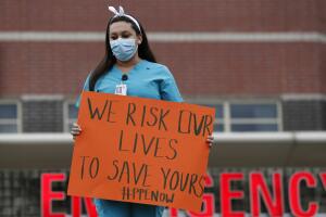 "Arriesgamos nuestra vidas para salvar las suyas" dice el cartel que una enfermera del centro médico Jacobi en el Bronx mostraba en el día de hoy a las puertas del hospital. Como muchas otras de sus compañeras, ella salió a protestar por la falta de PPE, o equipos personales de protección, necesarios para evitar el contagio y que desde hace semanas, profesionales médicos de todo el país vienen demandando.