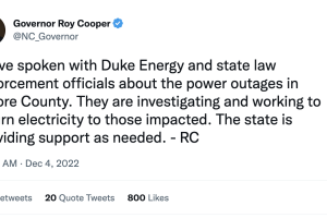 "Hablé con Duke Energy y los funcionarios estatales de la ley sobre los cortes de energía en el condado Moore. Están investigando y trabajando para devolver la electricidad a los afectados”, escribió.
