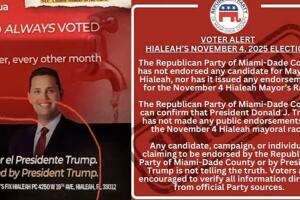 - article1 Min ReadOctober 30, 2025 06:42 PMBryan Calvo, uno de los candidatos a la alcaldía de Hialeah, anunció un supuesto respaldo del presidente Trump, pero el Partido Republicano de Miami-Dade lo desmintió.